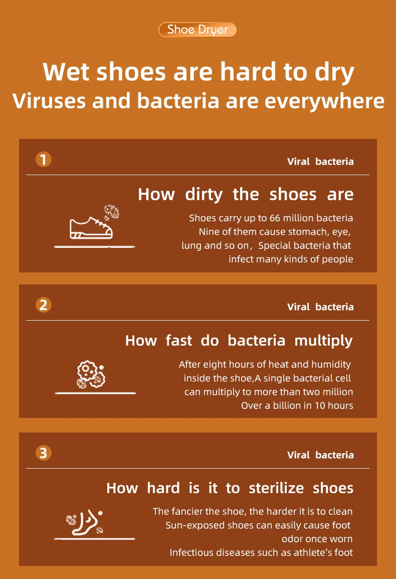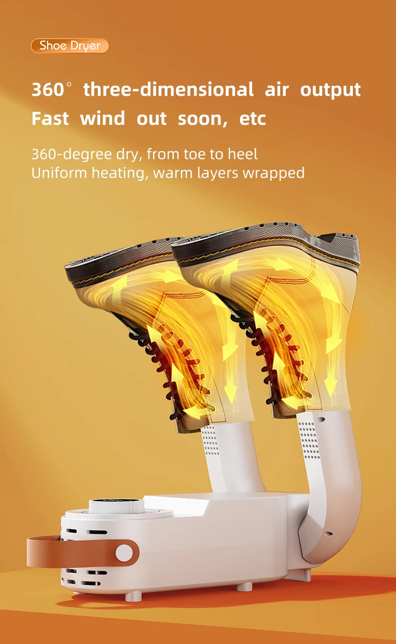 This advanced shoe dryer uses intelligent temperature and timing control to ensure safe, fast drying without damaging your shoes. Perfect for sports shoes, leather boots, gloves, or socks — you name it!